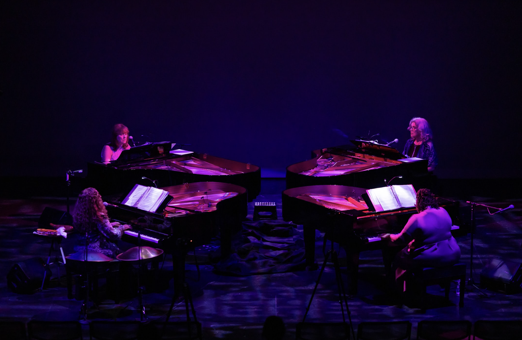 Eight Eight Time has four grand pianos on the stage, and all audience seating is on the stage with the pianos. During the performance, there will be projected visual elements, lights that go up and down on the pianos, and poetry that is read and projected.