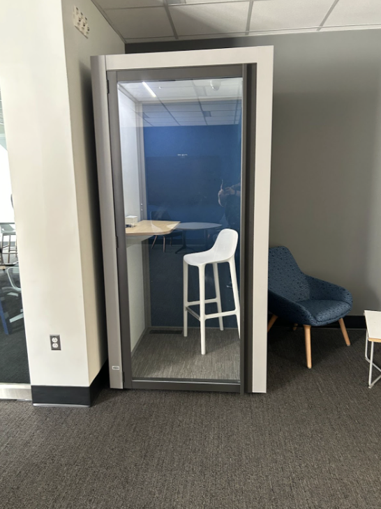 Gender neutral, accessible, single use bathrooms are near the Lockheed Martin Room (the cool down room). To the left of the Lockheed Martin Room is a little lounge set up of armchairs. The nook in the back left corner leads to the two bathroom doors.